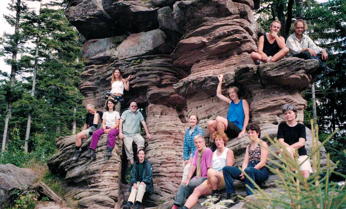 Auch Wildniswandern in den Vogesen ist von Anfang an im Programm. Oben rechts lässt sich Bernd Hild im schwarzen Shirt erahnen, der in den folgenden Jahren einige Touren leiten wird. Der Felsen ist als 'Steinernes Tor' bekannt.