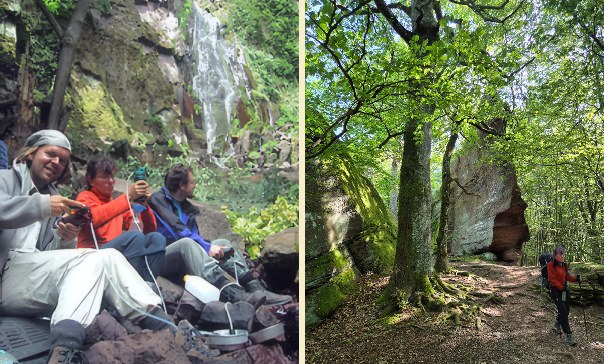 Ines Collmer nimmt an unseren Wildniswanderungen teil und sollte später eine wichtige Ausbildungsleiterin in der Wildnispädagogik werden. Im roten Pulli ist sie am Nideck-Wasserfall in den Vogesen darin vertieft, Wasser mit einem Keramikfilter zu reinigen.