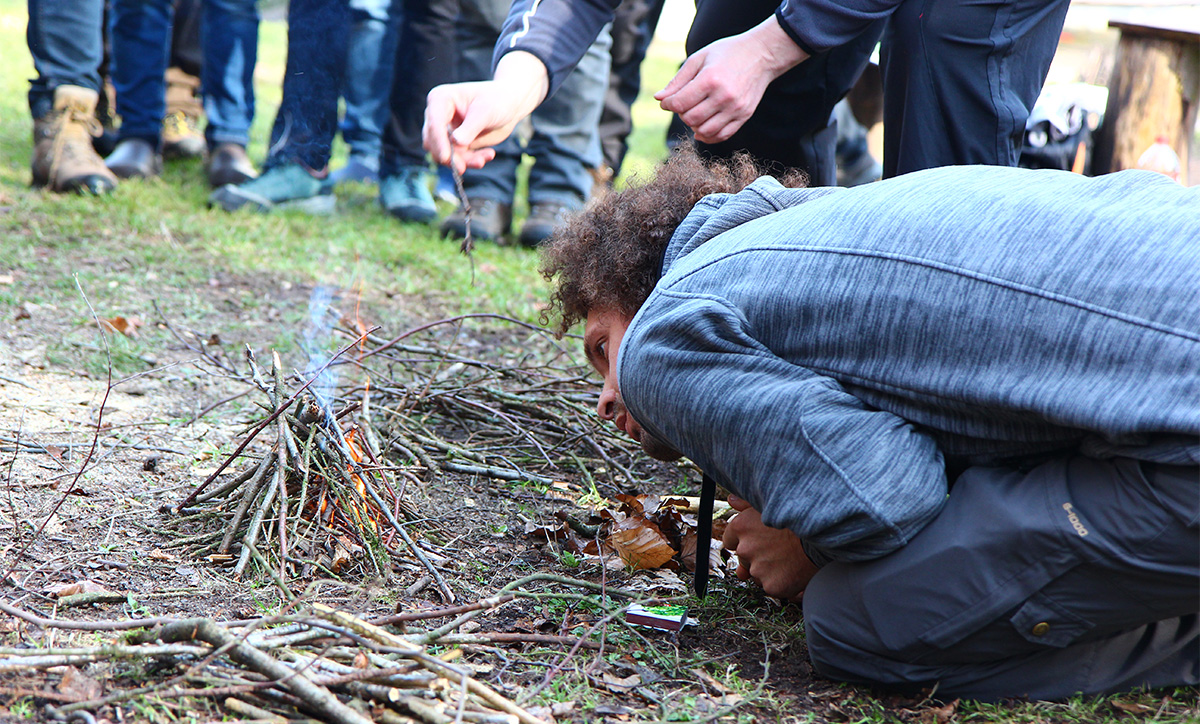 Unsere erste einjährige Weiterbildung Natur- und Wildnispädagogik wird von Matthias und Birgit in Baden-Württemberg durchgeführt. Mittlerweile bieten wir solche Ausbildungen in sechs unterschiedlichen Regionen von Deutschland an. Im Bild zündelt Teilnehmer Fabian Voß, der heute Ausbildungsleiter ist.