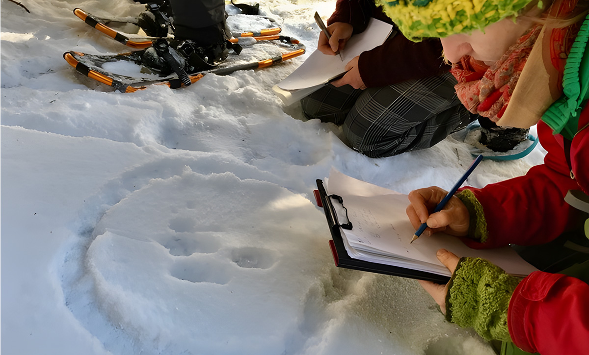 Im Auftrag des saarländischen Umweltministeriums gestalten wir wildnispädagogische Lehrgänge, die sich an Fachkräfte im sozialen Bereich wenden. Darüber hinaus startet unsere Weiterbildung Natur- und Wildnispädagogik im Nationalpark Bayerischer Wald. Das Foto zeigt angehende Spurenleser im Schnee.