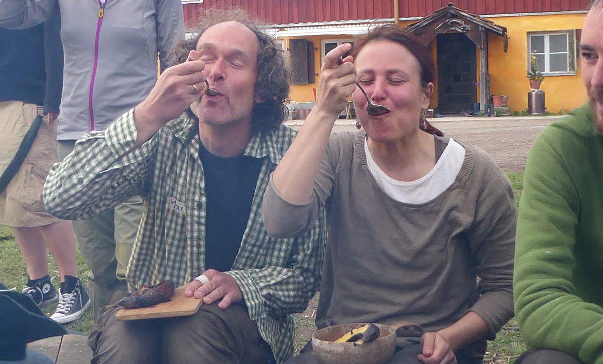 Die ersten Absolventen von Natur- und Wildnispädagogik III schließen unsere dreijährige Ausbildung ab. Darunter sind Tina Reitz, Lisa Moser und Martin Derrez, die heute selbst Ausbildungsgruppen leiten. Hier bringen Tina und Martin ihren eigenen Auszubildenden gerade bei, wie man Schokobananen genießt.