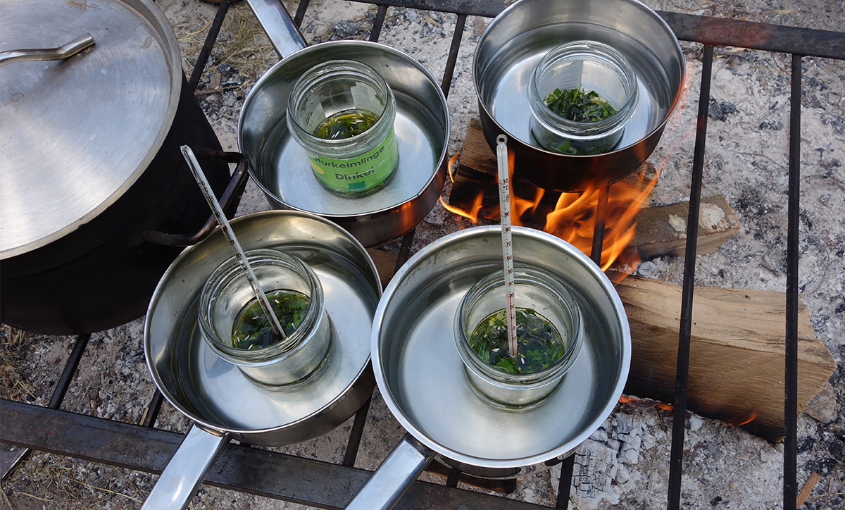 Wir verbringen viel Zeit damit, die sich ständig ändernden Coronaverordnungen in unterschiedlichen Ländern und Bundesländern zu studieren. Eines der wenigen gehaltenen Seminare ist das zur Heilkräuterkunde, wo wir nicht nur Salben wie im Bild, sondern auch Heiltees zur Immunstärkung und gegen Atemwegsbeschwerden herstellen.